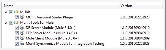 Los geht’s, Anypoint Studio starten (ich nutze aktuell 5.4.2), anschließend prüfen, ob wir aktuell sind und alle notwendigen Plugins installiert wurden: Über Help -> Check for Updates prüfen wir die Aktualität und spielen ggf. Updates ein. Je nach Studio hat man jetzt schon die volle MUnit-Unterstützung, aber auch das prüfen wir besser: Also Help -> Install New Software. Unter den Sites sollte http://studio.mulesoft.org/r4/munit schon vorhanden sein, falls nicht: bitte ergänzen. Wählt man die Site aus, darf man das MUnit-Plugin und einige Zusatzplugins installieren. Ich habe einfach mal alle ausgewählt, auch wenn wir in diesem Teil nur mit der Basis arbeiten: