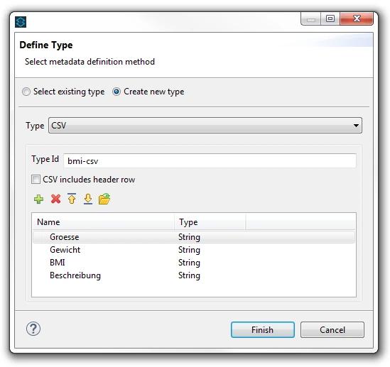 Über den Rechtsklick auf die Payload lassen sich auch noch die Meta-Daten der CSV-Datei definieren, entweder manuell oder über eine Beispieldatei: