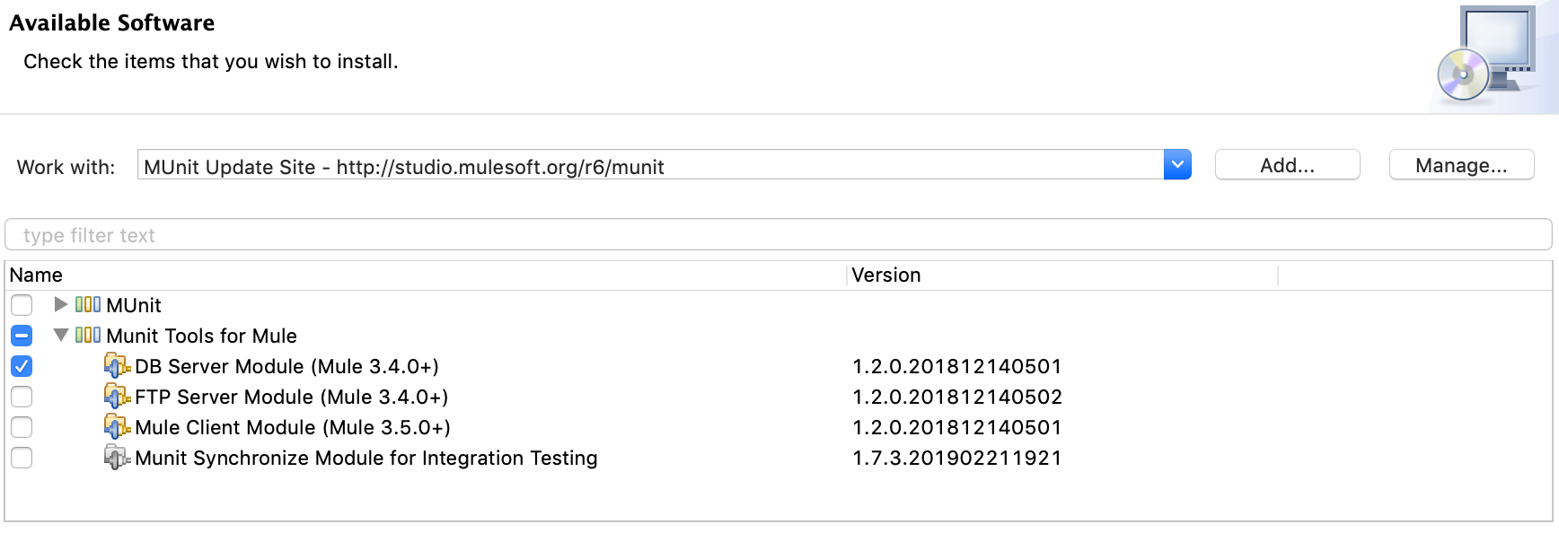 Die MUnit-Tools liefern ein Modul (namespace dbserver), mit dem eine InMemory-Datenbank einfach in Tests integriert werden kann. Vom AnypointStudio aus kann dieses Modul über die Munit Update Site installiert werden: