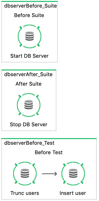 Aus Performance-Gründen ist es sinnvoll, die Datenbank möglichst selten hochzufahren, zu starten und zu stoppen. Daher wird das in den Before- bzw. After-Phasen der Test-Suite erledigt: