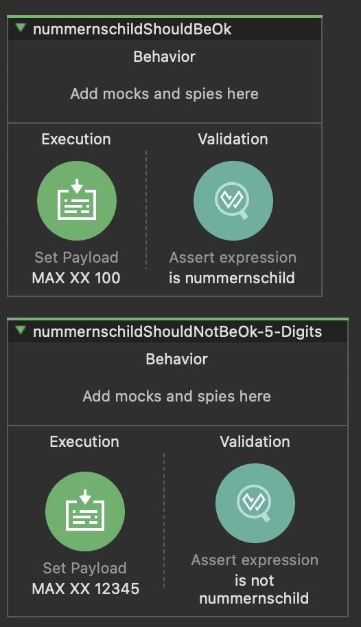 Nehmen wir zum Beispiel einmal an, wir wollen validieren, dass unser Prozess tatsächlich valide (deutsche) KFZ-Kennzeichen erstellt. Dafür wird erwartet, dass wir für eine größere Anzahl von Kennzeichen MUnit-Tests schreiben, um sicherzustellen, dass keine irregulären Kennzeichen erzeugt werden können.