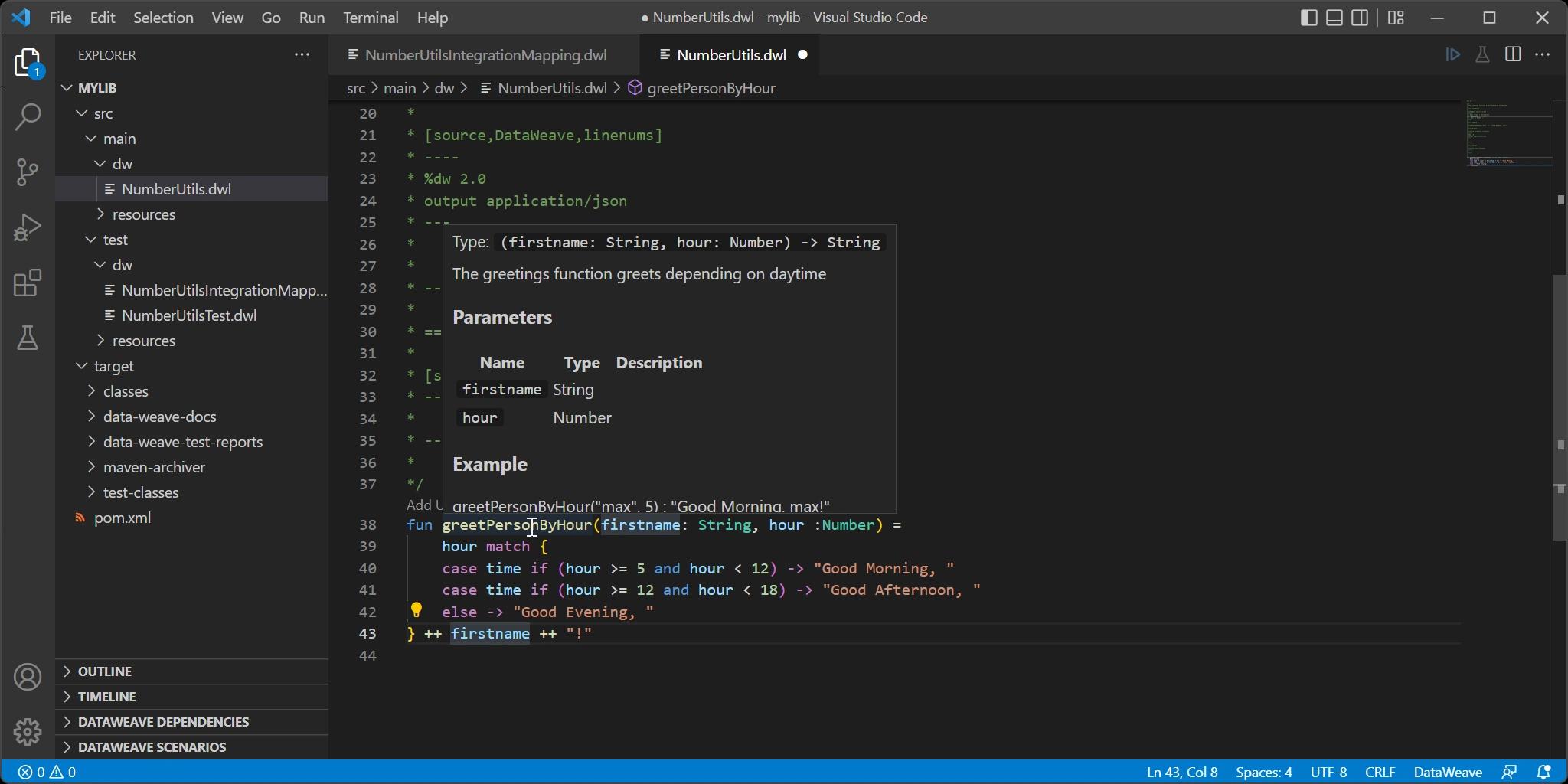 Auch kommentieren können wir unsere Methode mit einem einfach Klick auf Generate DataWeave Documentation direkt über unserer Funktion. So wird uns ein Template bereitgestellt, das wir nur noch ausfüllen müssen. Wenn wir dann mit der Maus über unsere Funktion fahren, sehen wir auch direkt, wie die Beschreibung später aussieht.