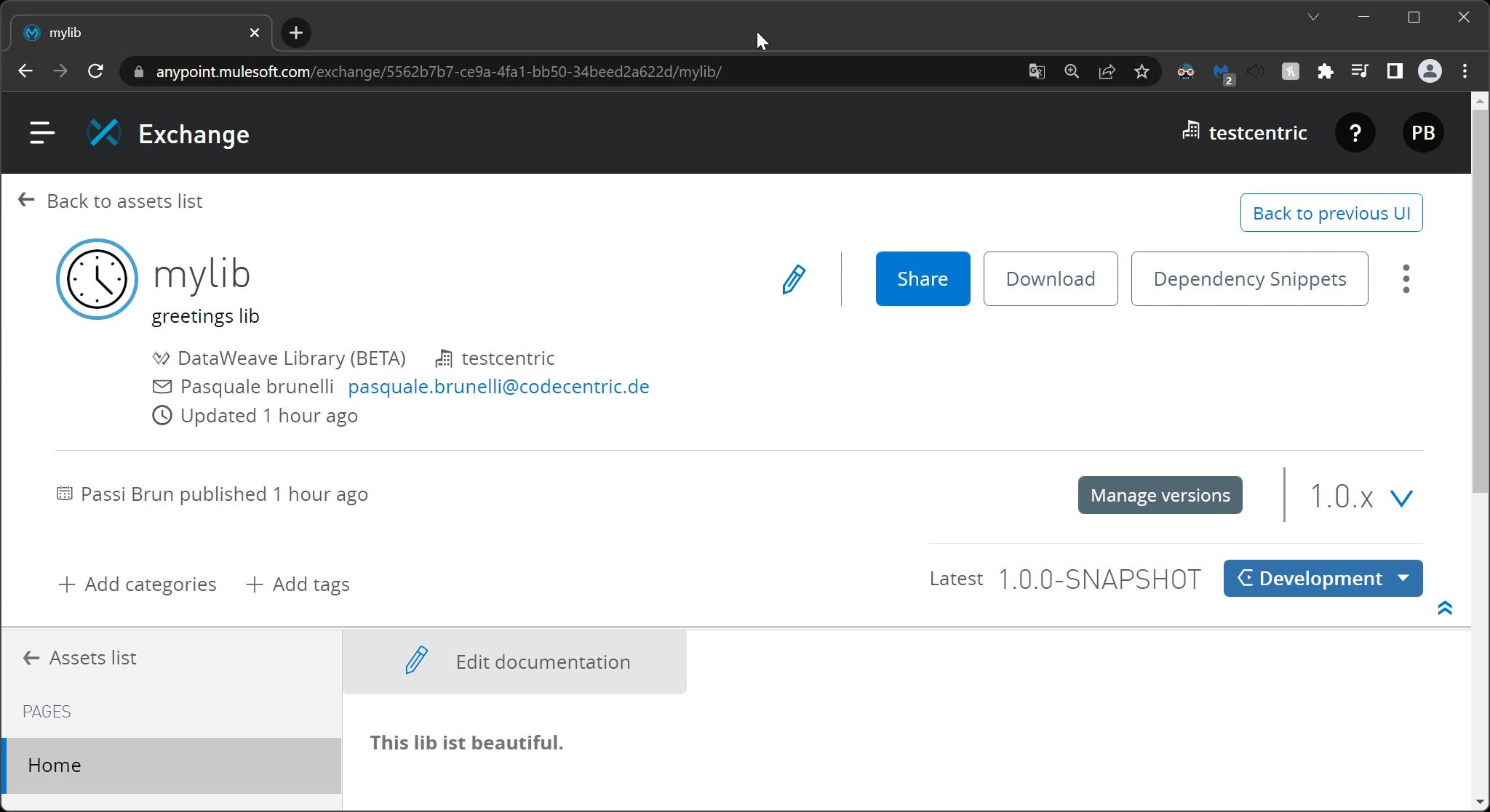 Wenn alles erfolgreich war, können wir nach kurzer Zeit unsere Library in Anypoint Exchange begutachten.