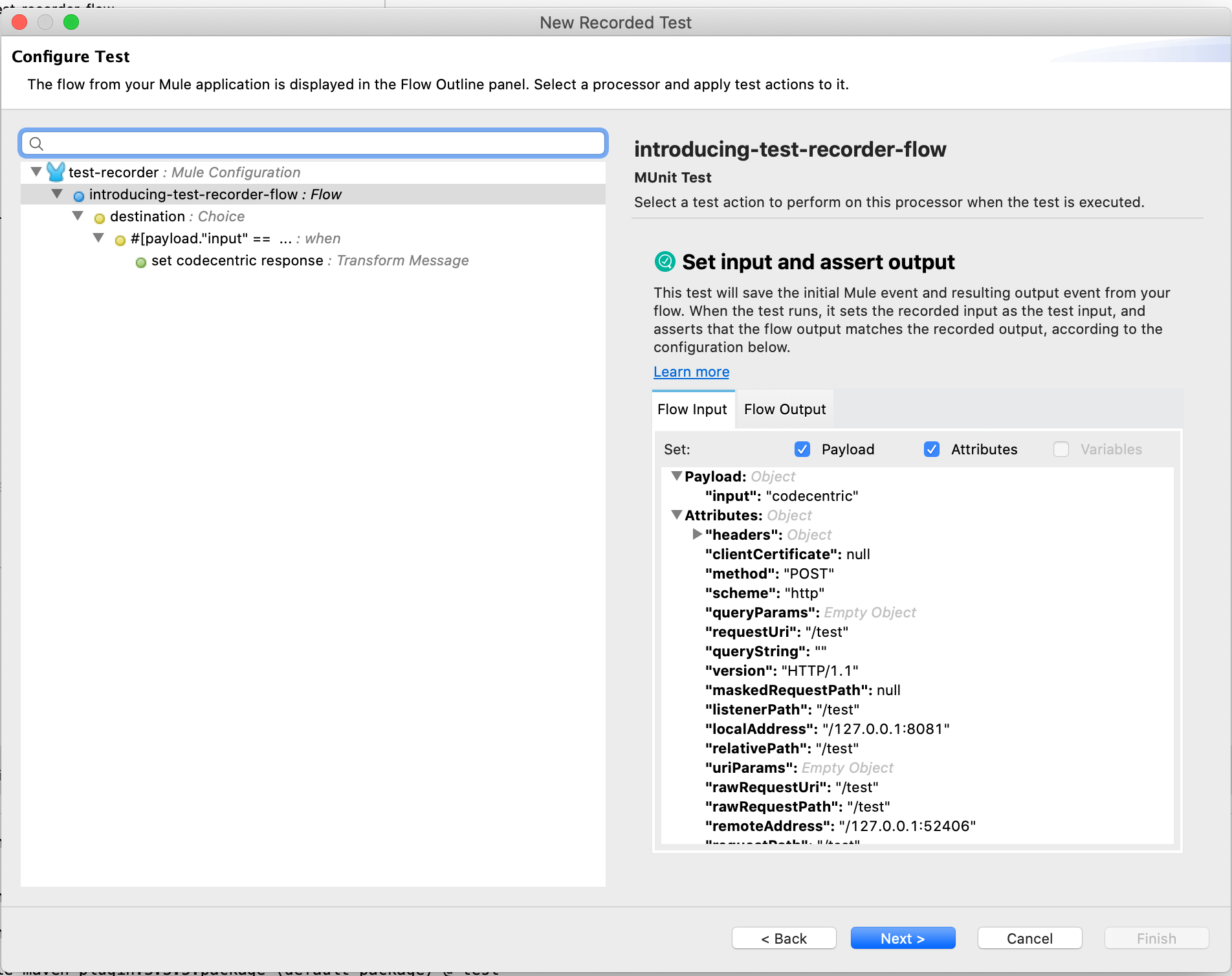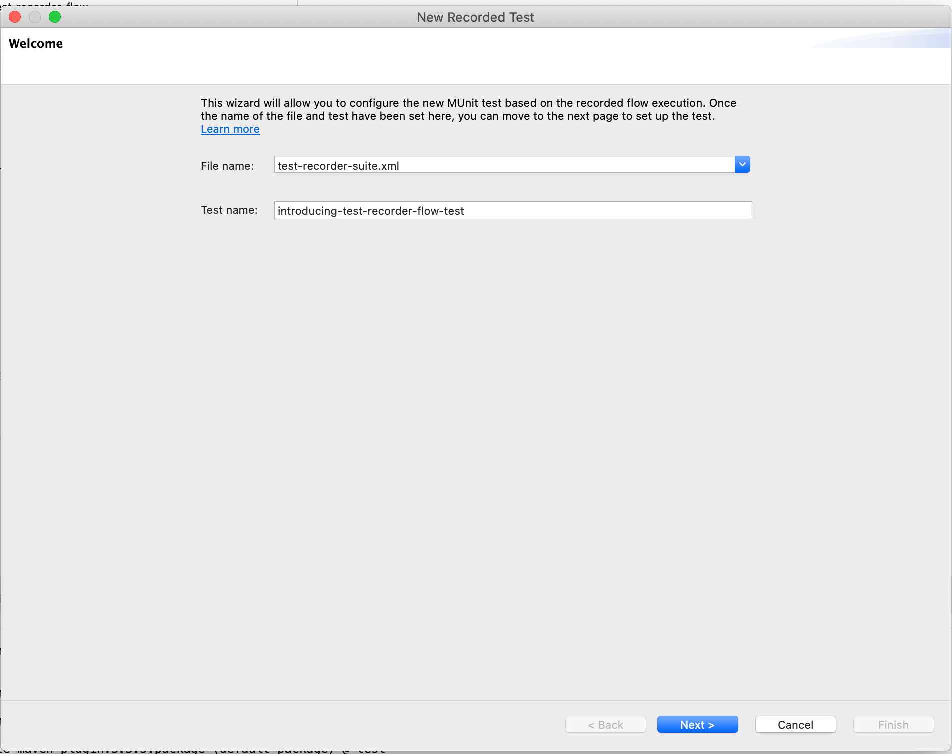 Auf der ersten Seite können wir den Namen des Tests und den Namen der Datei festlegen, in welcher der MUnit Test erstellt wird. (Der Name des Tests wird auch für das Package genutzt, in dem alle testbezogenen Dateien erstellt werden. Der Name des MUnit Tests „introducing-test-recorder-flow-test“ wird dabei zu dem Package-Namen „introducingtestrecorderflowtest“. Bei Bedarf kann man daran nachgelagert manuelle Anpassungen vornehmen.)