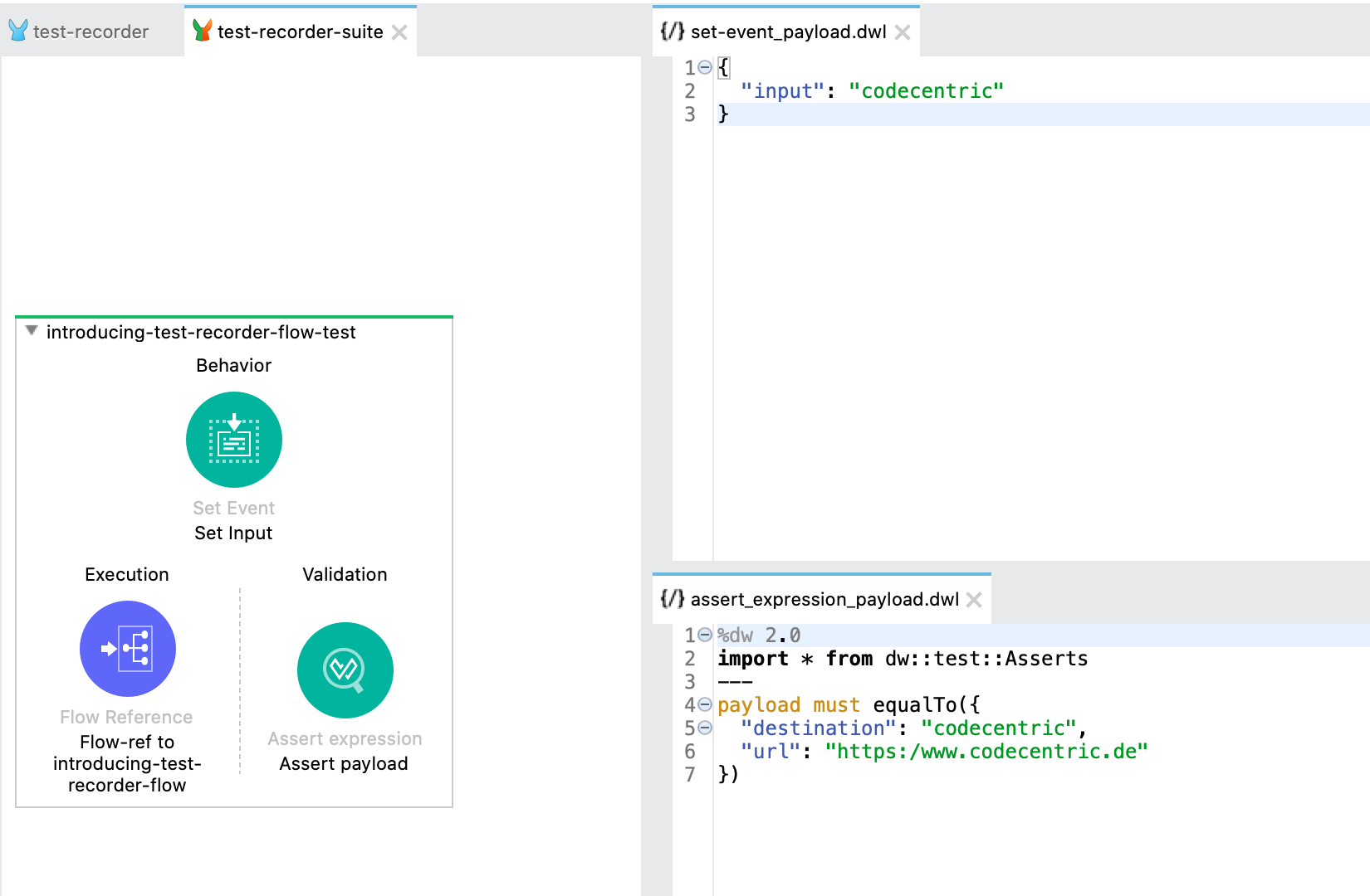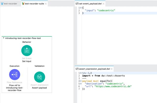 Im Hintergrund hat Mule nun eine Datei mit einem MUnit-Test erstellt, der unseren Vorgaben aus der Aufzeichnung entspricht. Alle Input und Output Parameter wurden dabei in *.dwl Dateien unter „test/resources/introducingtestrecorderflowtest“ abgelegt.