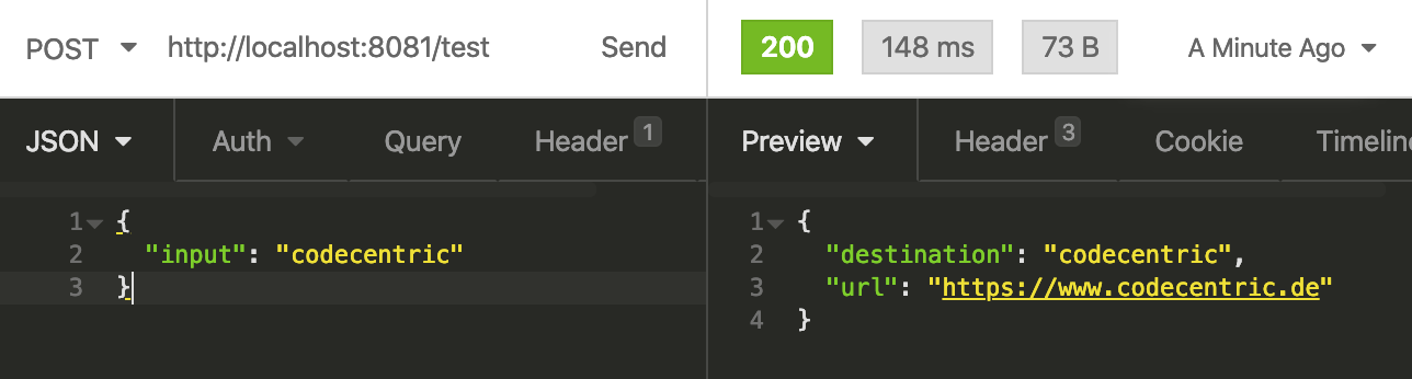 In unserem Beispiel kann ein Nutzer einen HTTP-Request an unsere Applikation schicken. Wenn der Body dabei „codecentric“ beinhaltet, wird die URL der codecentric-Webseite als Response geliefert. In allen anderen Fällen erhält der Nutzer die Antwort, dass die Anfrage zu keinem Ergebnis geführt hat.