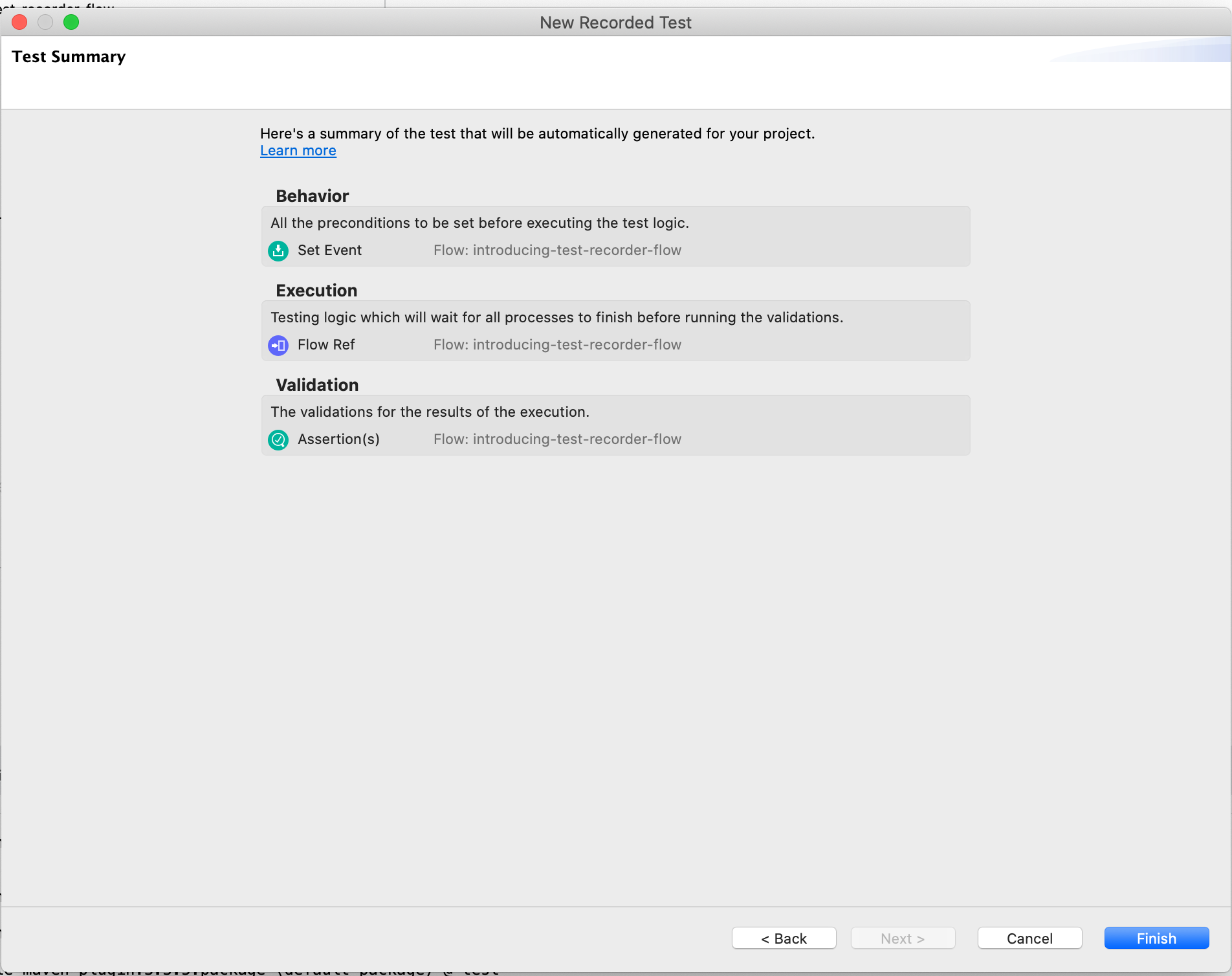 Wir können die Konfiguration nun mit „Finish“ beenden und schon beginnt die automatische Erstellung des MUnit-Tests.