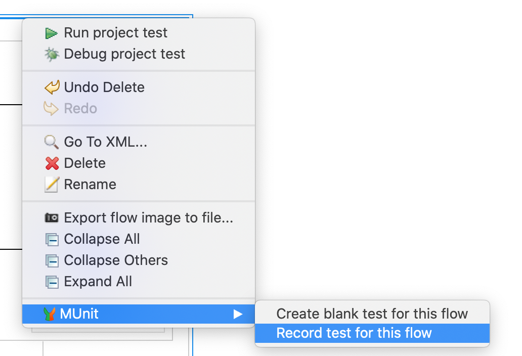 Als ersten Schritt müssen wir unsere Anwendung unter Einbeziehung des Test Recorders starten. Dafür klicken wir mit der rechten Maustaste auf unseren Flow und wählen „MUnit“ > „Record test for this flow“.
