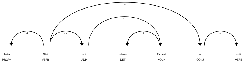 5document = nlp("Peter fährt auf seinem Fahrrad und lacht.")