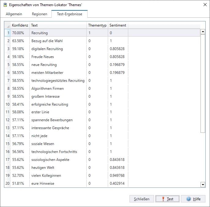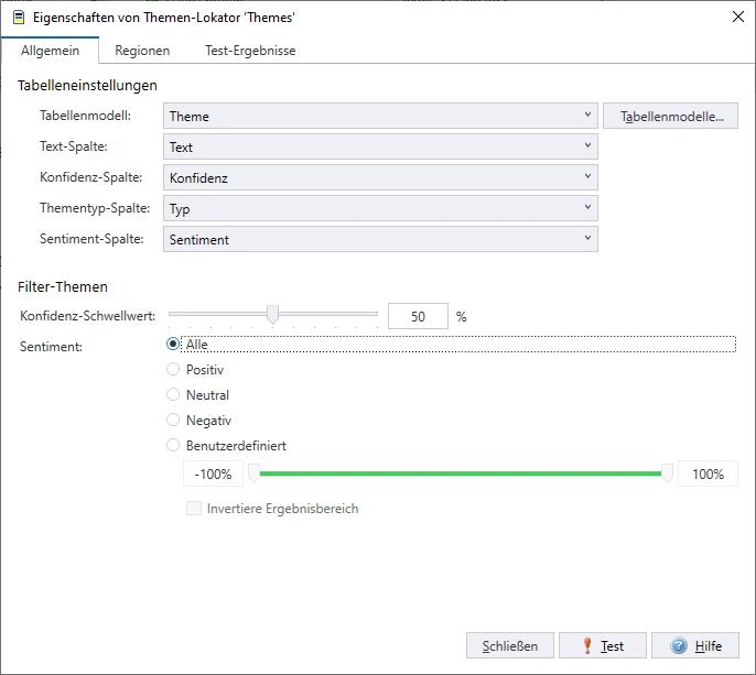 Über den Konfidenzschwellwert und die Sentiment-Einstellungen kann man die Ergebnisliste konfigurieren. Auf dem Regionen-Tab kann man die KTM-üblichen Regionseinschränkungen (Dokument, Seiten, Bereiche) vornehmen.