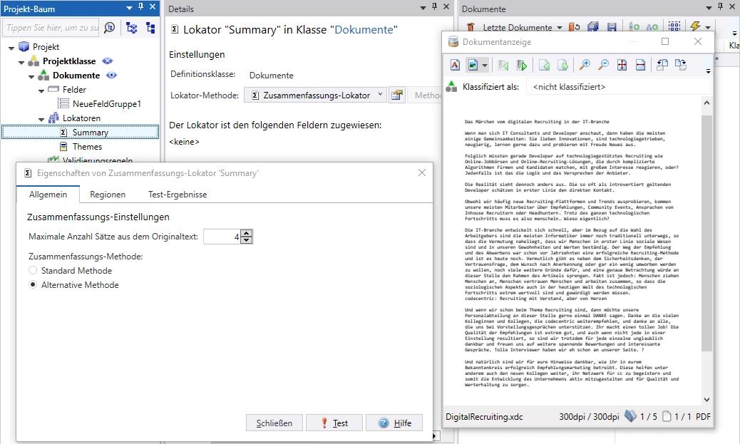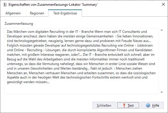 Der Zusammenfassungs-Lokator bietet zwei alternative Methoden der Textanalyse. Leider wird die unterschiedliche Vorgehensweise der beiden Methoden nirgends erläutert, so dass man auf eigene Tests zur Bestimmung des besten Ergebnisses angewiesen ist. Bei Olgas Beispieltext fand ich das Ergebnis der alternativen Methode passender. Über die Satzanzahl legt man fest, wieviele Sätze als Zusammenfassung zurückgegeben werden. Auf dem Regionen-Tab kann wieder die KTM-übliche Regionseinschränkung (Dokument, Seiten, Bereiche) eingestellt werden. Ein Druck auf den Test-Knopf liefert auch hier das sofortige Ergebnis: