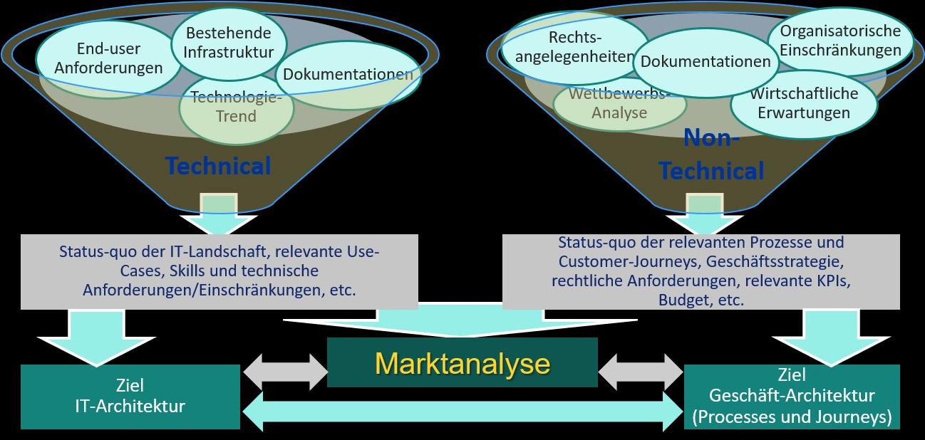 Die Sammlung und Bewertung von Anforderungen kann nicht als eigenständiger Schritt betrachtet werden. Das heißt, es handelt sich nicht um eine Aktivität, die nach oder vor bestimmten Phasen durchgeführt und gelöst werden kann. Die Evaluierung von Werkzeugen sollte zusammen mit der Sammlung und Verfeinerung von Anforderungen durchgeführt werden. Die Marktanalyse ist nichts anderes als ein iterativer Prozess, der sowohl die technische als auch die geschäftliche Architektur und die Anforderungen beeinflusst und gleichzeitig von diesen beeinflusst wird.