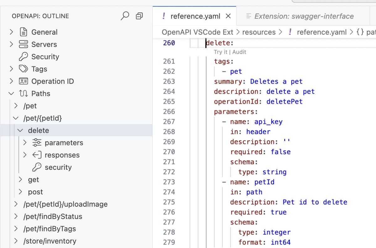 Die Erweiterung OpenAPI (Swagger) Editor enthält alle Basics (Linting, Intellisense, Dokumentation-Preview) zu einem gewissen funktionellen Grad und unterstützt auch Snippet-Generierung. Ein Highlight ist die einfache, navigierbare Übersicht über die OAS in der Seitenleiste. Über diese bekommt man nicht nur eine Zusammenfassung der OAS, sondern kann auch im Code zu der gewünschten Stelle springen.
