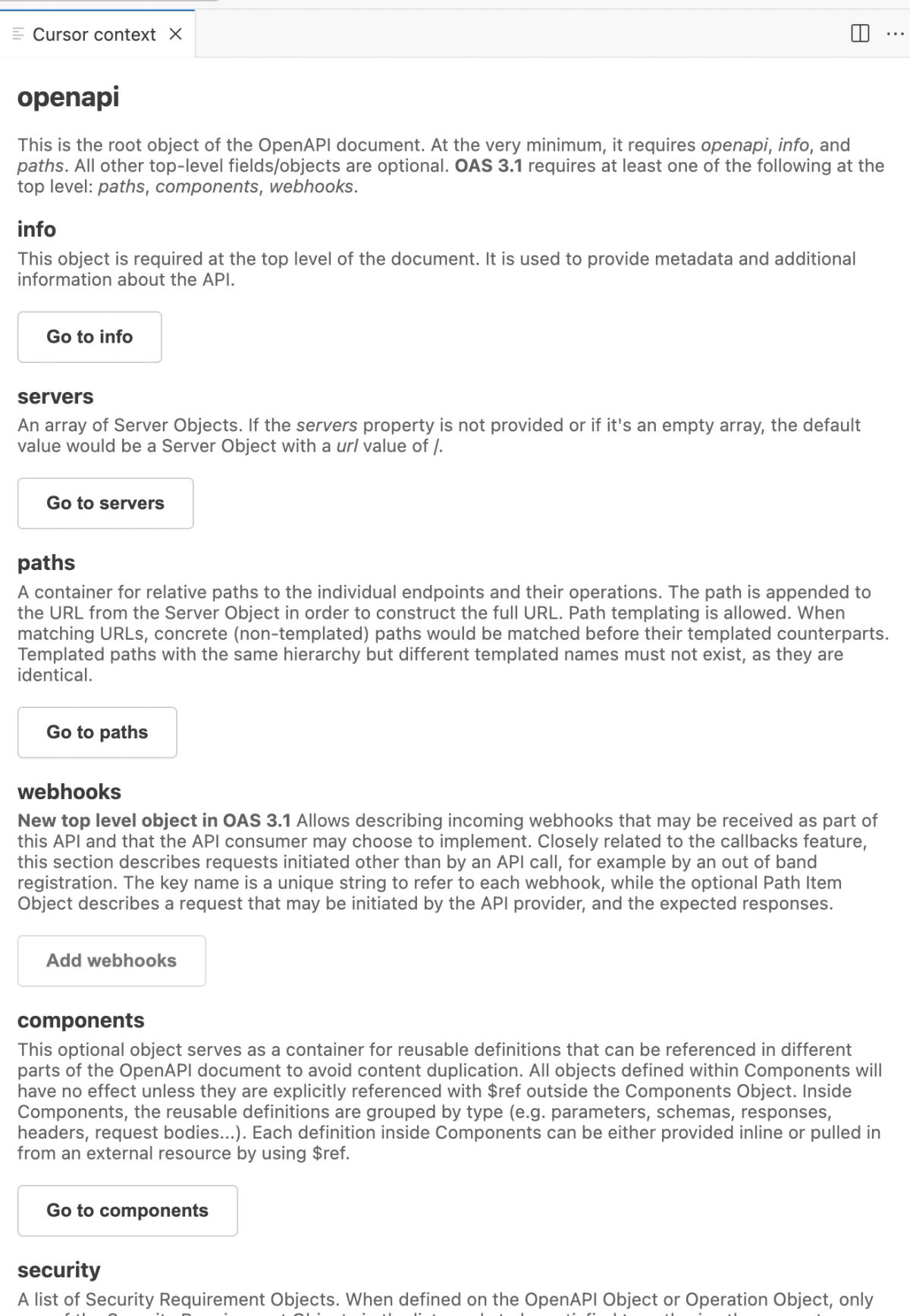 Der Cursor-Context öffnet sich per default in der Übersicht, dem „Root“-Verzeichnis der OAS. Zu jedem Abschnitt, jedem Unterabschnitt und vielen weiteren Schlüsselwörtern werden im Cursor-Kontext Erklärungstexte bereitgestellt.