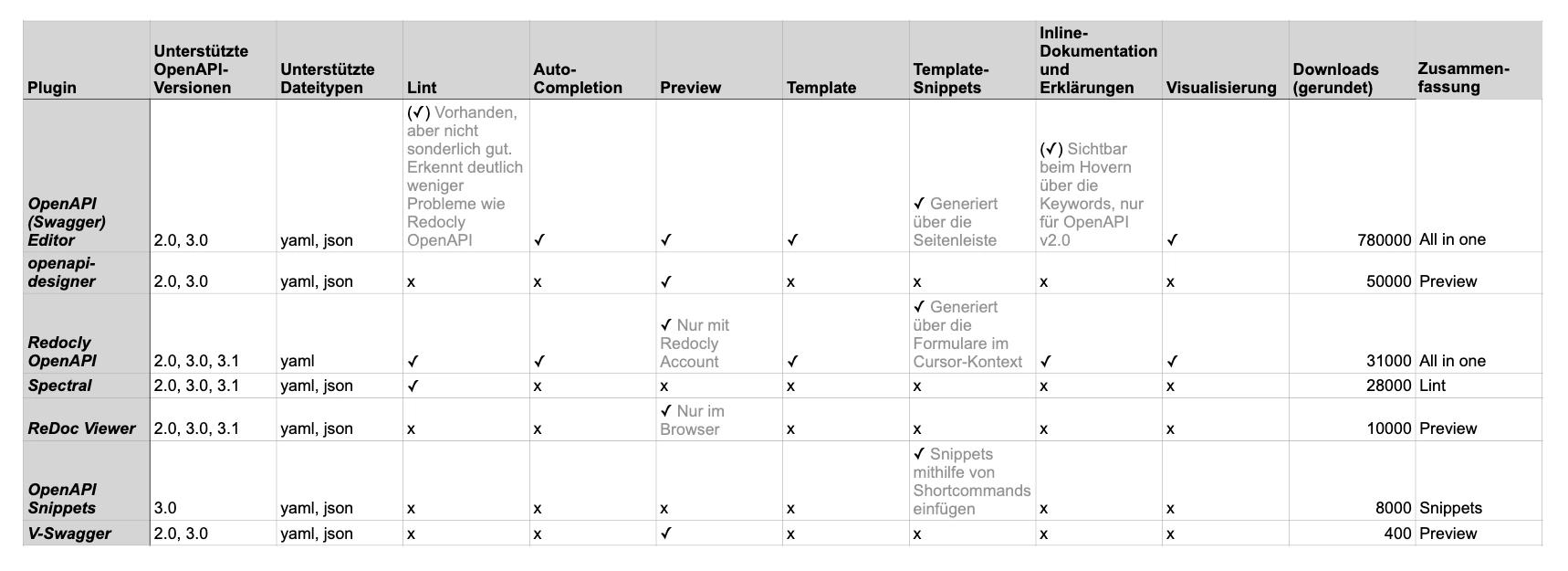 Insgesamt wurden 15 VS-Code-Erweiterungen für OpenAPI untersucht. Dabei wurden sieben Erweiterungen nach einem kurzen Test aufgrund von größeren Bugs und Fehlern verworfen und die verbliebenen Erweiterungen hinsichtlich folgender Merkmale verglichen: