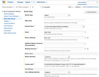TeamCity benutzt ebenso wie Jenkins nicht das mvn Executable. Die Umgebungsvariable ATLAS_HOME kann entweder auf Projekt- oder Buildebene konfiguriert werden. Im Maven Buildschritt muss die „Custom“ Maven Option gewählt werden und der Pfad …/atlassian-plugin-sdk-5.0.3 übergeben werden.