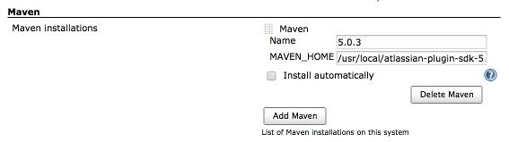 Jenkins benutzt nicht das mvn Executable, um den Maven Build auszuführen. Daher ist von den bei Bamboo vorgestellten Varianten nur die erste umsetzbar. Dazu muss zunächst die Umgebungsvariable ATLAS_HOME in der globalen Konfiguration mit dem Wert …/atlassian-plugin-sdk-5.0.3/ eingetragen werden. Zusätzlich muss eine Maven Installation konfiguriert werden, deren MAVEN_HOME auf das Verzeichnis …/atlassian-plugin-sdk-5.0.3/apache-maven-3.2.1/ verweist. Leider ist es nicht möglich, das EnvInject Plugin zu nutzen, um die global definierte Variable ATLAS_HOME in die einzelnen Builds zu übernehmen (siehe auch https://issues.jenkins-ci.org/browse/JENKINS-17620 bzw. https://issues.jenkins-ci.org/browse/JENKINS-18234 ).