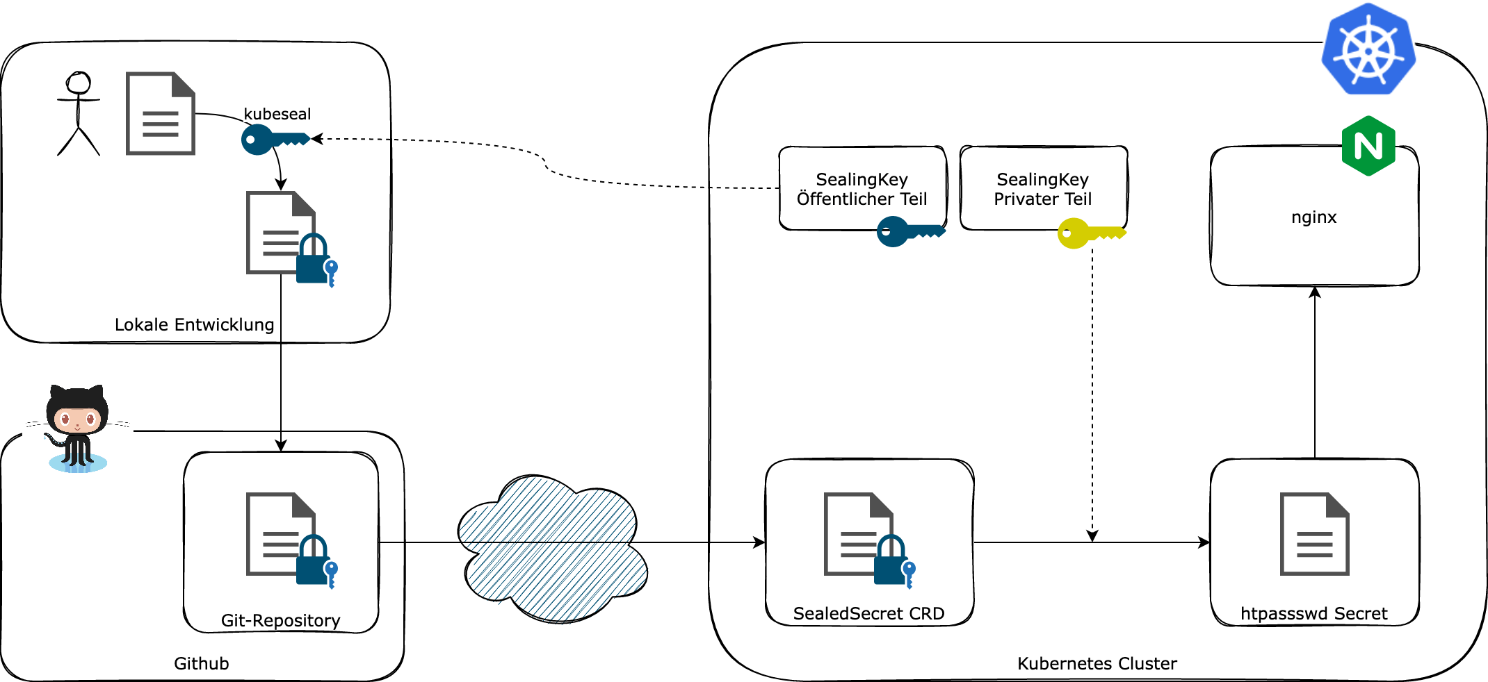 Der Entwickler nutzt das kubeseal-Kommandozeilenwerkzeug, um den Passwort-Hash lokal zu verschlüsseln. Kubeseal lädt dazu den öffentlichen Teil des SealingKeys aus dem Cluster. Der Git-Commit, der den Hash beinhaltet, kommt durch ein git push in das Repository auf GitHub. Flux beobachtet das Git-Repository und erstellt die SealedSecret Custom Resource Definition (CRD) für den verschlüsselten Hash. Der SealedSecrets-Controller nutzt den SealingKey, um das SealedSecret in ein normales Kubernetes-Secret zu entschlüsseln. Das Secret wird schließlich dem Nginx-Pod zur Verfügung gestellt.