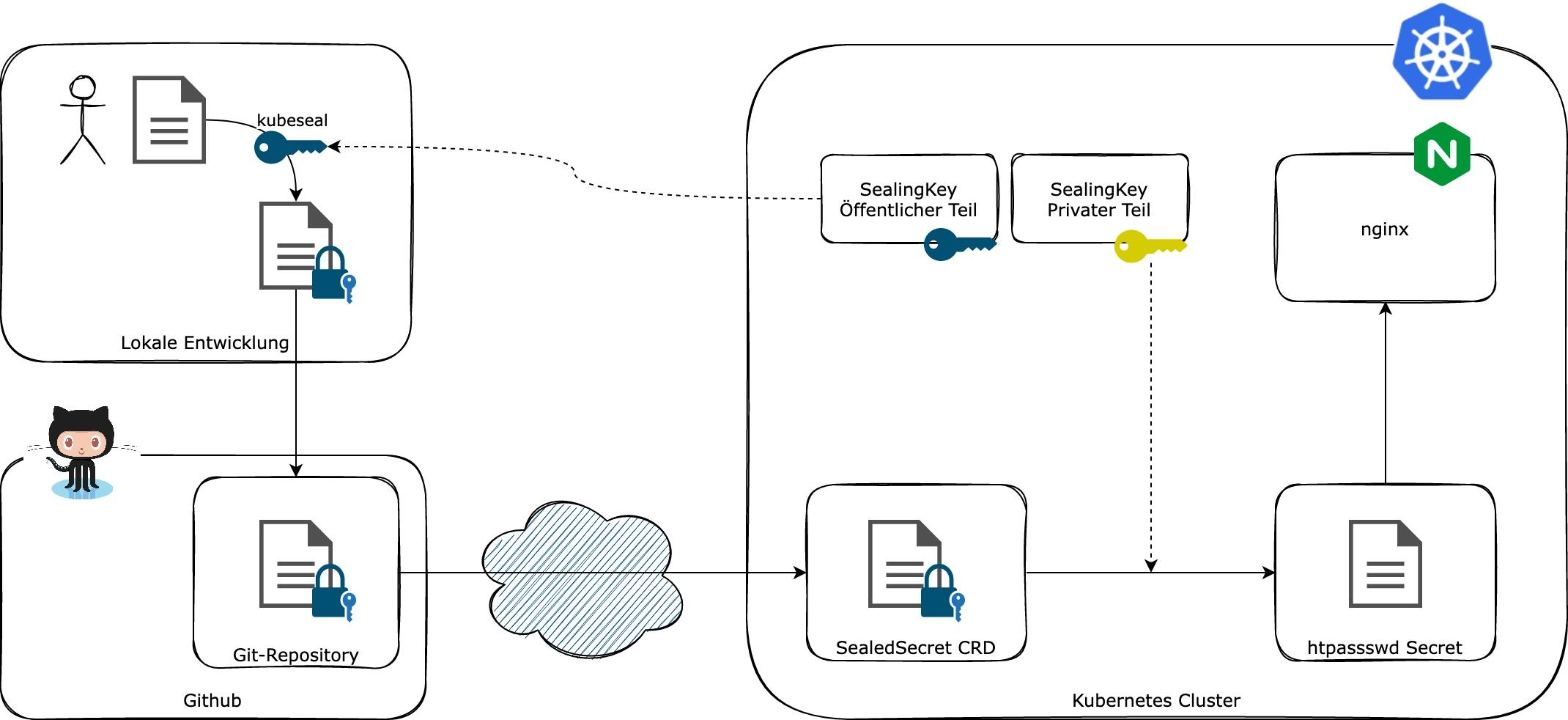 -Kommandozeilenwerkzeug, um den Passwort-Hash lokal zu verschlüsseln. Kubeseal lädt dazu den öffentlichen Teil des SealingKeys aus dem Cluster. Der Git-Commit, der den Hash beinhaltet, kommt durch ein git push
