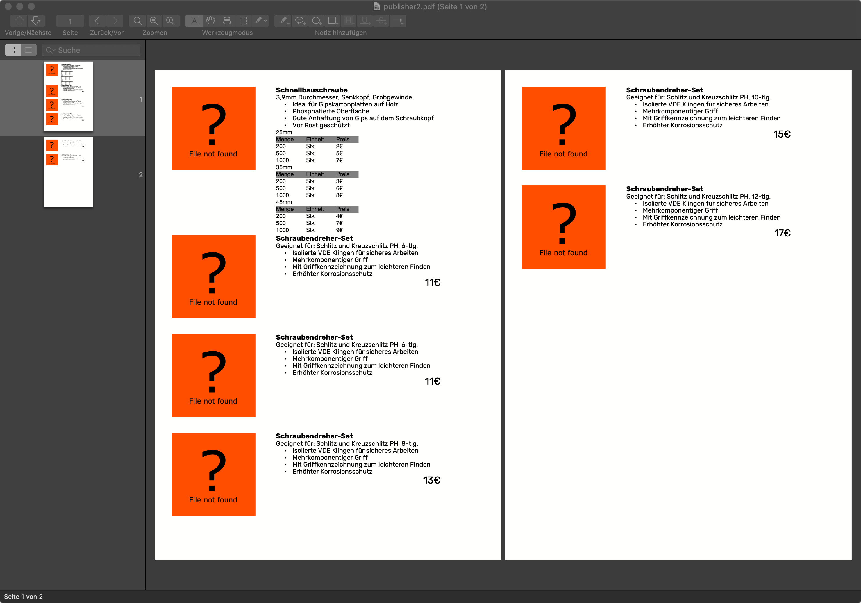 Das Ergebnis stellt nun einen Produktkatalog mit einem einfachen Tabellenlayout, inklusive Logik, dar. Da bei Erstellung des PDFs die entsprechenden Produktbilder nicht vorhanden waren, wurde diese direkt durch einen Platzhalter ersetzt. Die Erstellung des PDFs dauerte auf einem MacBook Pro (2,3 GHz 8-Core Intel Core i9, 32 GB RAM) genau 0.579982 Sekunden.