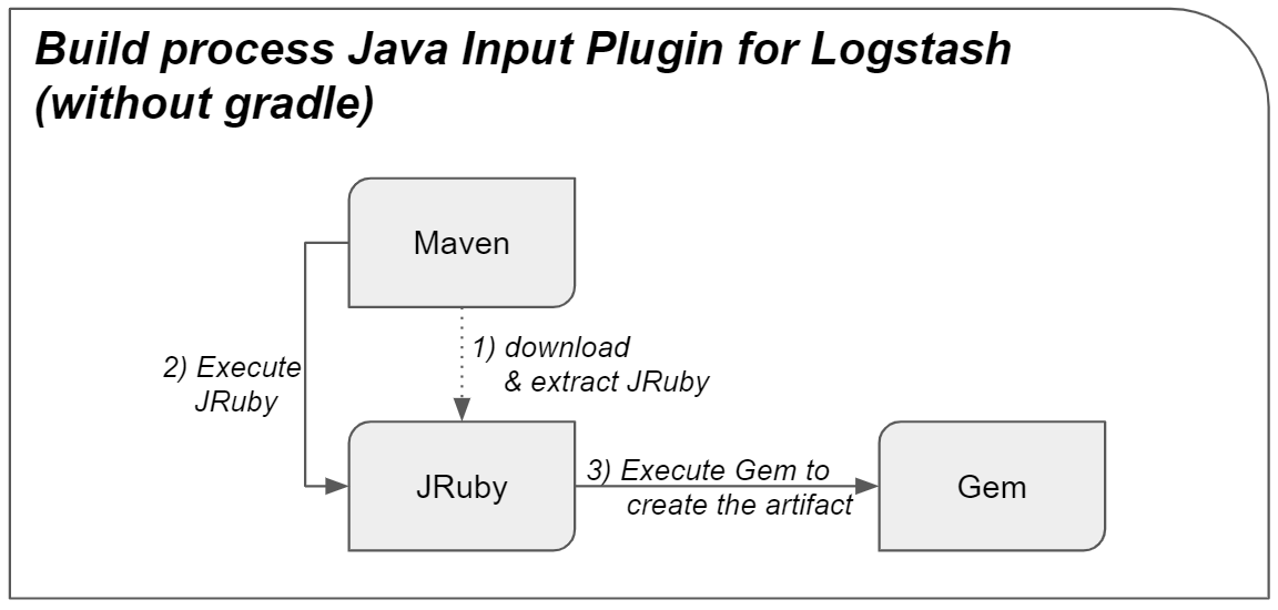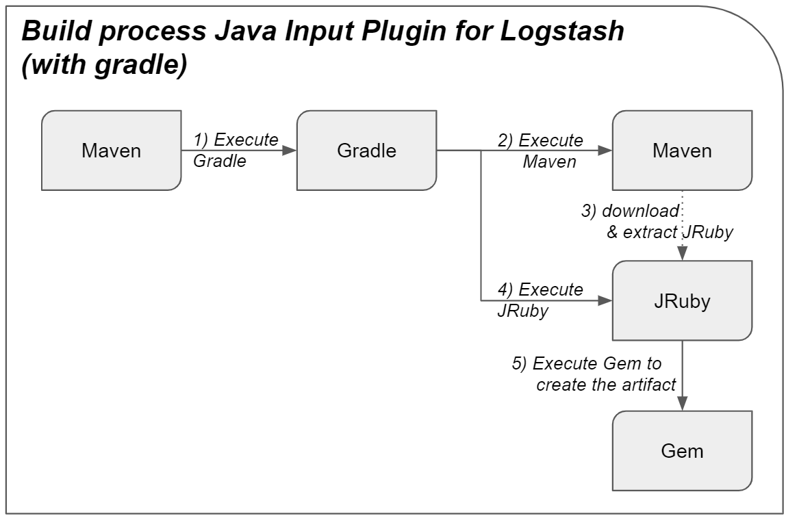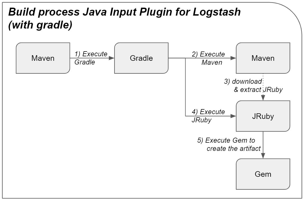 Wird das Logstash-Java-Input-Plug-in anschließend gebaut, verwendet das Skript gradle.build die Datei rubyUtils.gradle von logstash. In diesen Utils wird JRuby heruntergeladen und anschließend verwendet. Für das Herunterladen und Entpacken von JRuby wird der Befehl commandLine ‚./mvnw‘, ‚clean‘, ‚install‘, ‚-Pdist‘, ‚-Pcomplete‘ verwendet. Gradle führt Maven an dieser Stelle über einen Maven-Wrapper aus. Dies ist im Rahmen des Apache-PLC4X-Projekts ungünstig. Denn PLC4X verwendet Maven selbst als Build-Tool. Daher ergäbe sich bei einfacher Einbindung von Gradle aus der Elastic-Anleitung folgender Build-Prozess: