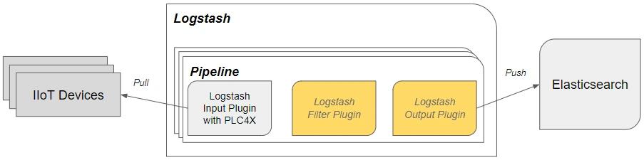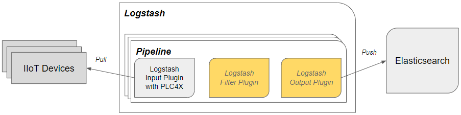 Wir verwenden im Plug-in das Framework Apache PLC4X, um Daten von IIoT-Geräten (Industrial Internet of Things) mittels Pull-Prinzip abzufragen. Diese Daten werden an Logstash übergeben, welches diese anschließend über ein Output-Plug-in der Pipeline mittels Push-Prinzip weiterleitet. Hier haben wir beispielsweise ElasticSearch gewählt.