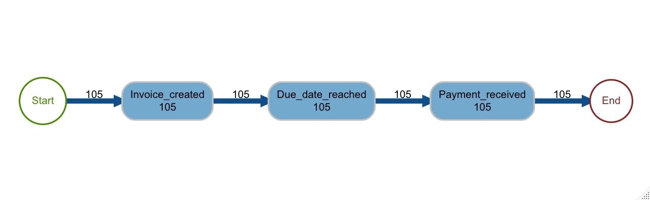 In Abbildung 3 können wir anhand des Prozessplans erkennen, dass der häufigste vorkommende Prozess aus drei Aktivitäten besteht. In 105 Fällen beginnt der Prozess mit der Rechnungsstellung. Bevor die Zahlung eingeht, wird die Zahlungsfrist überschritten.