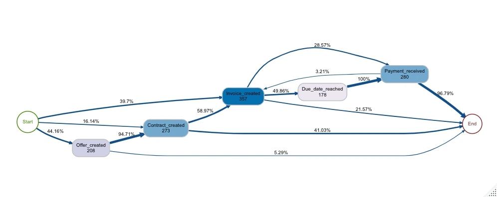 Darauf aufbauend werden mit Process Mining, ähnlich wie im klassischen Prozessmanagement, die Prozesse oft in einem Prozessplan dargestellt. Dieser visualisiert die Reihenfolge der Arbeitsschritte in einem Flussdiagramm.
