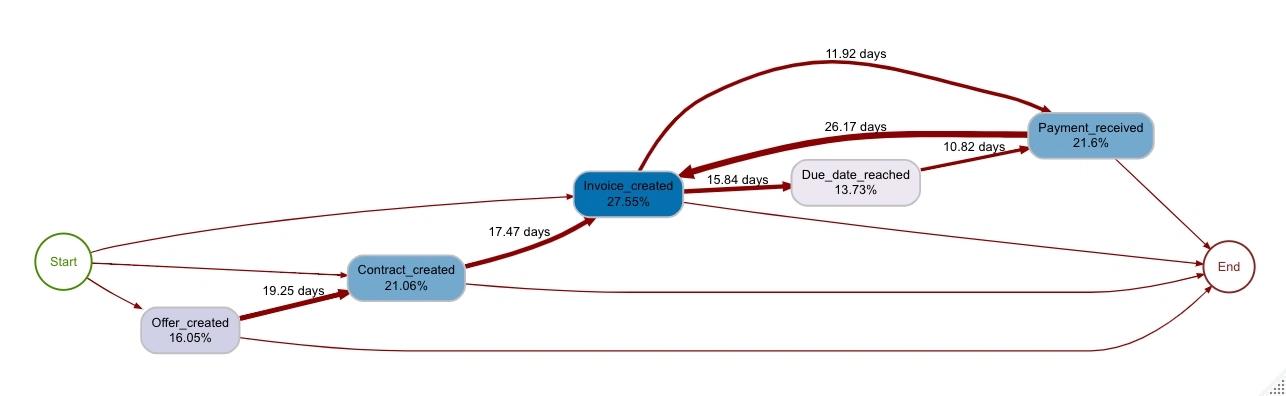 Mit der Hinzunahme des Performanceprofils entnehmen wir dem Prozessplan in Abbildung 5, dass die Dauer zwischen der Auftrags- und Angebotserstellung im Durchschnitt 19 Tage beträgt. Zudem fällt auf, dass sofern die Zahlungsfrist der Rechnung überschritten wird, die Zahlungen durchschnittlich weitere 11 Tage später verbucht werden. Gehen die Einnahme vor der Rechnungsstellung ein, beträgt die Bearbeitungszeit im Durchschnitt 26 Tage.