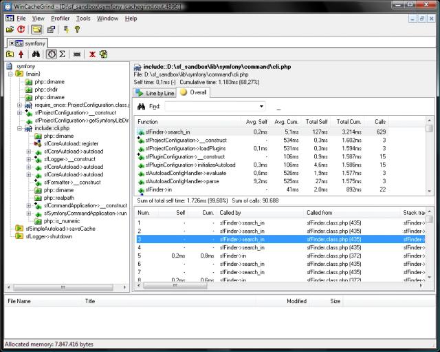 1Function : sfFinder->search_in 2Avg. Self : 0,2ms 3Avg. Cum. : 5,1ms 4Total Self: 127ms 5Total Cum.: 3214ms 6Calls : 629