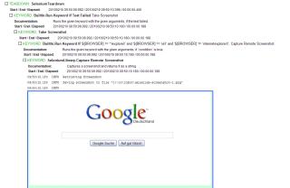 So wird in jedem Teardown geprüft ob der Test fehlgeschlagen ist. Ist dies der Fall wird das Keyword „Take Screenshot“ aufgerufen. Diesen prüft noch den Browser, und nur wenn dieser nicht der Internet Explorer ist, wird das neue Keyword „Capture Remote Screenshot“ aufgerufen, welchen den Screenshot dann auch sofort ins Logfile einbettet: