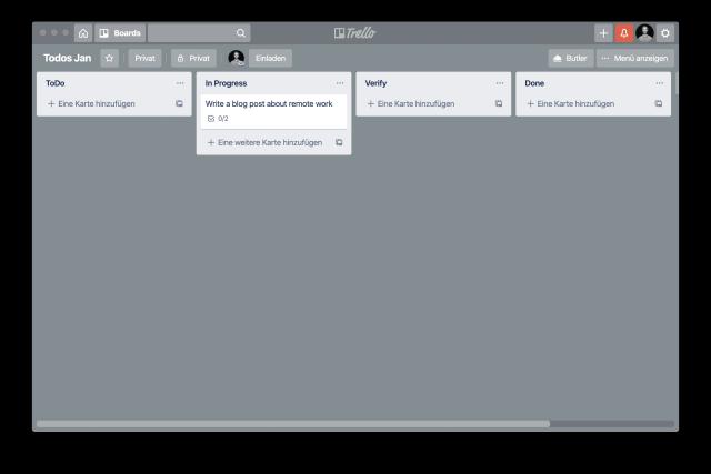Für Teams, denen diese Art von Metriken nicht wichtig ist, reicht auch die einfache und leicht zu nutzende visuelle Repräsentation in Trello . Das Bild unten zeigt einen solchen sehr einfachen, in Trello abgebildeten Prozess. Die freie Variante dieses Werkzeugs wird für die Bedürfnisse von Teams, die in diese Richtung starten möchten, erstmal völlig ausreichen.
