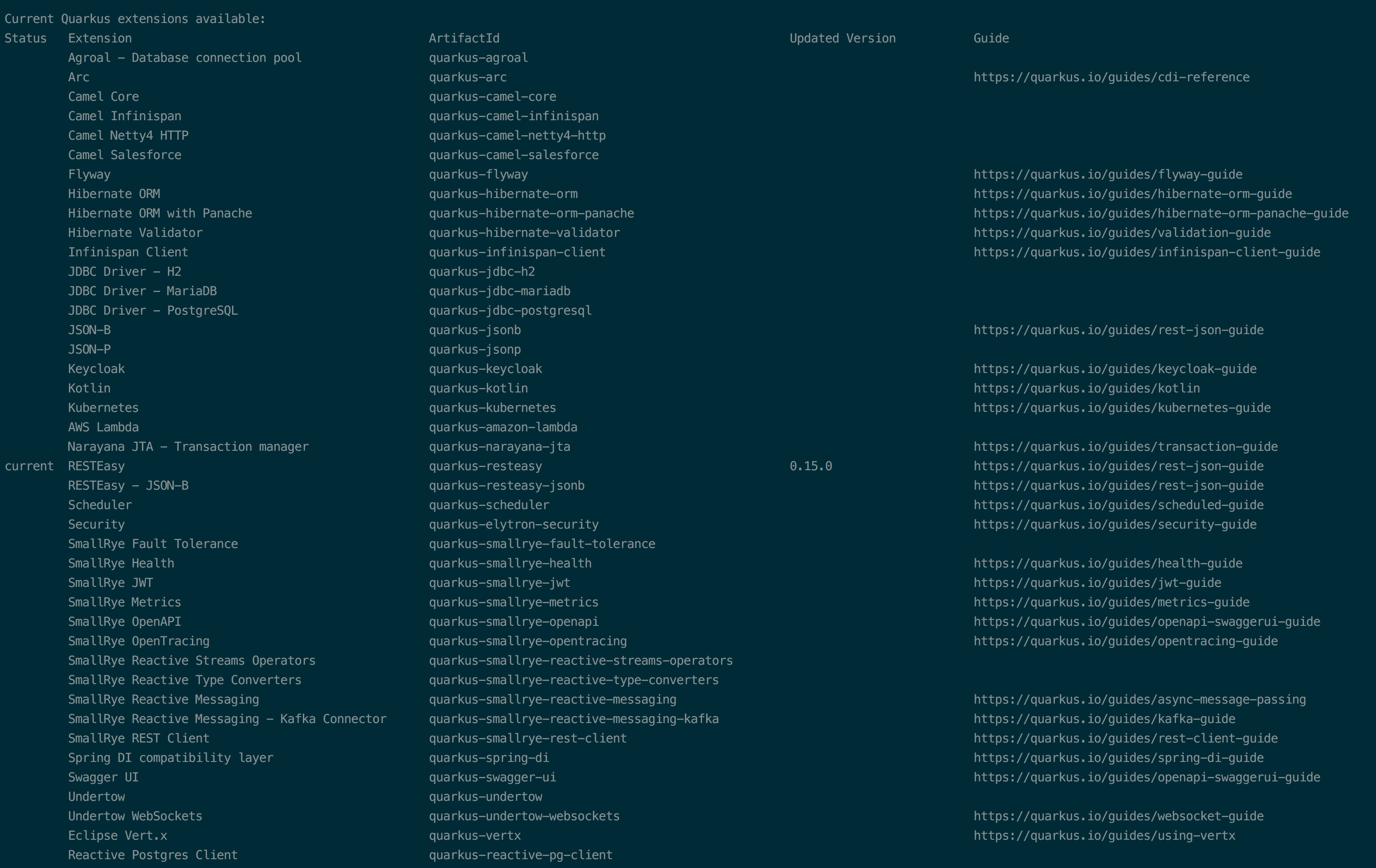 Als nächstes werden die für die Anwendung benötigten Dependencys hinzugefügt. Dies kann auch über das Maven-Plug-in gemacht werden. Mithilfe des Befehls ./mvnw quarkus:list-extensions kann eine Liste der verfügbaren Extensions ausgegeben werden.