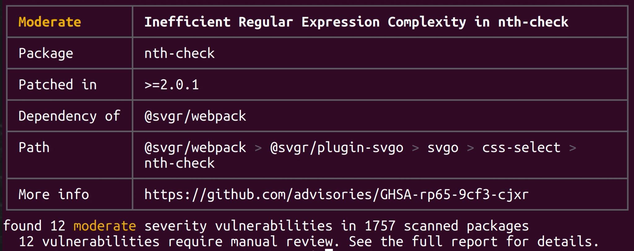 aufspüren. Ein großer Vorteil dieser Variante ist, dass sie alle bekannten Schwachstellen abdeckt und nicht nur einzelne Pakete. Außerdem ist die Ausgabe übersichtlicher. Neben Anzahl und Ernsthaftigkeit der Schwachstellen gibt es für jede Angabe über die gepatchten Versionen und Abhängigkeiten eine Referenz auf den Eintrag in der GitHub-Advisory-Datenbank.