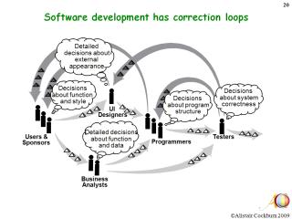 - Ist ein Unternehmerisches Spiel: Softwareentwicklung sei ein kooperatives, endliches Spiel (jeweils bis zum nächsten Release am Iterationsende), mit einem ständigen Zielkonflikt zwischen der Lieferung der Software und dem Vorbereiten auf die nächste Runde. Man hätte drei Zugmöglichkeiten: Erfinden, Entscheiden oder Kommunizieren mit dem Problem, dass eine (Projekt-) Situation niemals einer anderen gleicht, also immer wieder neue Strategien entwickelt werden müssen.
