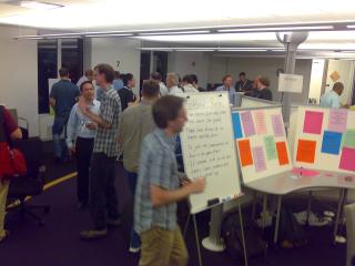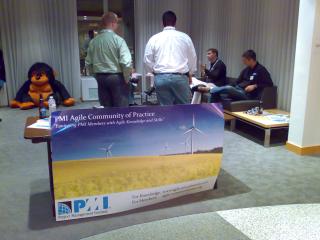 Die Motivation ist mir den ganzen Tag über unklar gewesen, bis abends während des „Open House“ bei ThoughtWorks (mehr dazu später) die „Agile Community of Practice “ des Project Management Instituts (PMI ) gegründet wurde. Dort wurde in die gleiche Kerbe geschlagen, dass das klassische Projekt Management Techniken zu bieten hat, die für große Projekte notwendig seien, gleichzeitig aber Agilität eine immer größere Rolle spielt. Da bisher das PMI und die Agile Alliance gedanklich eher auf verschiedenen Seiten wiederfanden, betrachte ich die Keynote als Versuch den Weg in die Zukunft zu ebnen, damit beide Organisationen zusammenfinden können.
