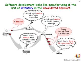 Benutzt schlanke (lean) Prozesse: Man kann sich die Softwareentwicklung ganz nach dem Schema einer Fabrik vorstellen, wenn man „nicht validierte Entscheidungen“ als Stück betrachtet, dass durch die einzelnen Stufen der Produktionskette fließt. So kann man relativ einfach Engpässe identifizieren und den Flaschenhals entschärfen.