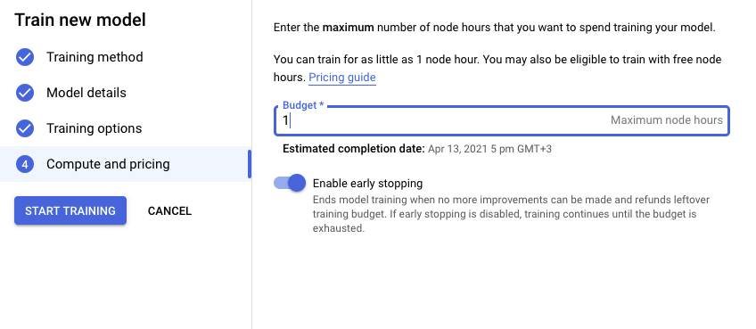 Ein Budget (node hours) wird für das Training, das bei unseren Tests zwischen 4 und 12 Stunden gedauert hat, festgelegt. Nach Abschluss stellt Google in der GCP eine Analyse des produzierten Modells zur Verfügung. Diese Analyse beinhaltet verschiedene in der Deep-Learning-Umgebung übliche Metriken, um ein Modell zu evaluieren.