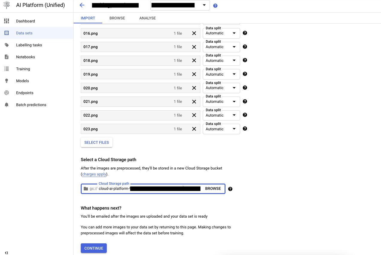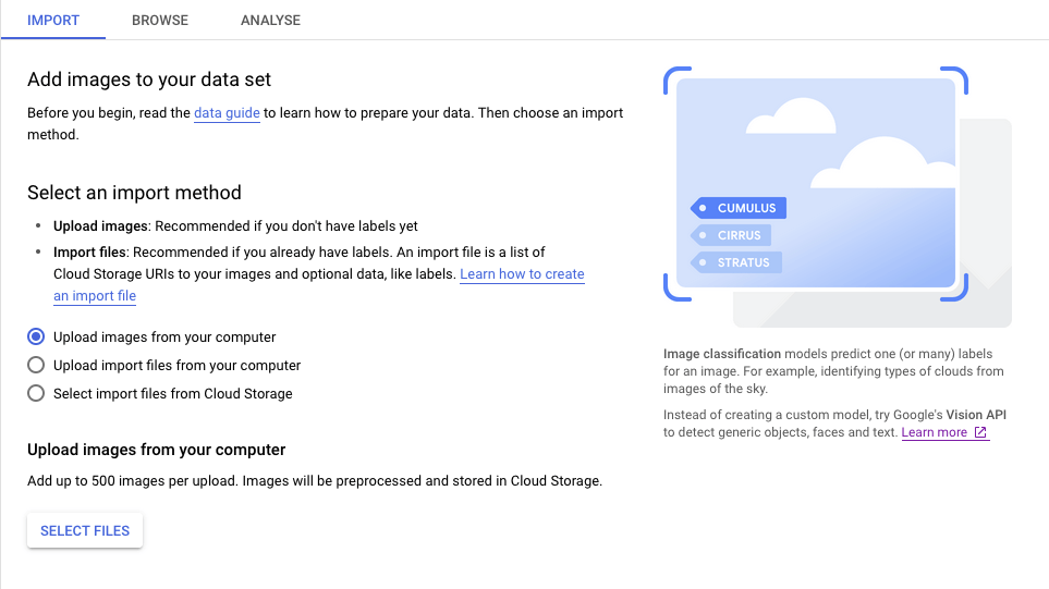 Sobald Bilder von der lokalen Festplatte ausgewählt wurden, werden sie hochgeladen und in der Oberfläche angezeigt. Beim Hochladen wird automatisch ein Cloud Storage Bucket erstellt, der unten in der Oberfläche benannt werden kann, bevor man den Datensatz erstellt. Leider können über die AutoML-Oberfläche zum Zeitpunkt der Veröffentlichung dieses Posts nur 500 Bilder auf einmal hochgeladen werden. Um dieses Problem zu umgehen, können Bilder direkt in einen Cloud Storage Bucket hochgeladen werden. Bei dieser Möglichkeit muss der GCP-Nutzer allerdings selber eine CSV-Datei erstellen, die die Bilder in Klassen aufteilt. Diese Datei wird dann in Verbindung mit dem GCS Bucket von AutoML genutzt, um den Datensatz zu erstellen.