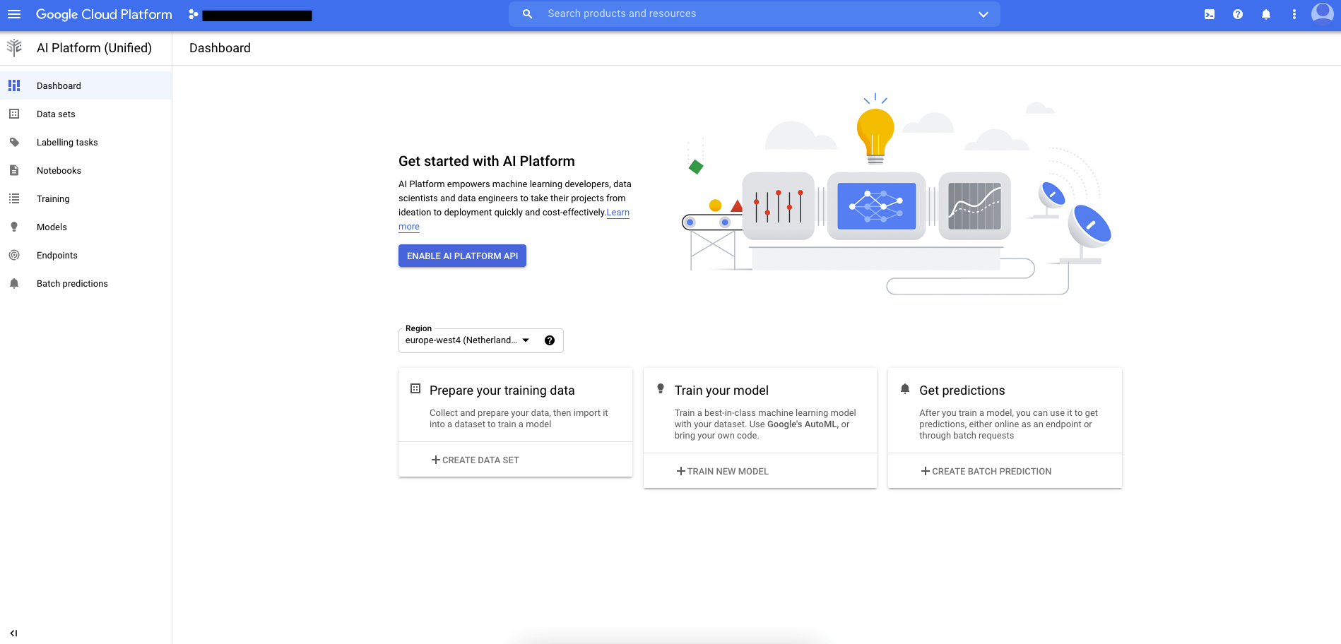 Für AutoML und AI Platform (Unified) gibt es eine Weboberfläche, die die oben genannten Schritte ermöglicht. Folgend wird die AI Platform (Unified) mit einem einfachen Beispiel gezeigt, wobei die gezeigten Teile sehr ähnlich zu dem Gegenstück von AutoML sind. Sobald man ein Google-Cloud-Projekt erstellt hat und zu der AI Platform (Unified) navigiert, sieht man folgendes Bild. Um nun ein Modell zu erstellen, wird zunächst ein Datensatz erstellt.
