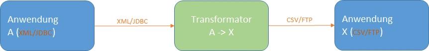 Nehmen wir zur Veranschaulichung an, A stellt die Daten als XML über JDBC bereit, und Anwendung X möchte die Daten als CSV-Datei per FTP erhalten. Da weder A noch X bereit sind, Anpassungen vorzunehmen, führen wir einen Transformator ein, der die Daten von Anwendung A entgegennimmt und in ein Format umwandelt, dass auch Anwendung X versteht.