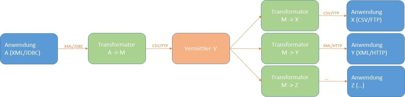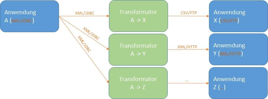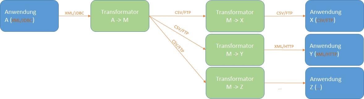 Der Unterschied ist nun, dass für jede Anwendung ein eigener, nur für diese Anwendung zuständiger Transformator existiert, der die Übersetzung in das gemeinsame Datenmodell und den Transportkanal übernimmt. Dies funktioniert im Übrigen in beide Richtungen, also auch „rückwärts“, z.B. von Anwendung X nach A.
