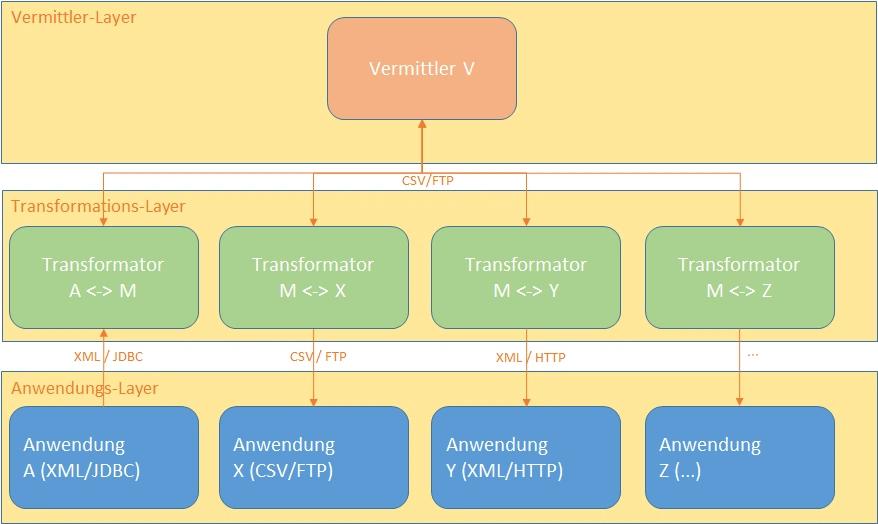 Um diese Vorteile langfristig zu erhalten, wollen wir unbedingt vermeiden, dass Anwendungen am Vermittler vorbei direkt miteinander kommunizieren. Hierzu nutzen wir ein bekanntes Architekturkonzept: Wir führen Layer ein: