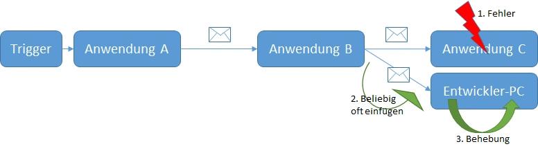 Wir können Debuggen und Testen, ohne dass der Trigger ausgelöst werden muss, und ohne dass Anwendung A oder B beteiligt sind. Dies ist z.B. hilfreich, wenn Nachrichten von Anwendung A nur exakt einmal oder nur mit erhöhtem Aufwand bereitgestellt werden können – z.B. weil ein Duplikate-Filter aktiv ist, der entsprechende Entwickler Urlaub hat, im Meeting steckt, die Daten nur einmal täglich geliefert werden usw.