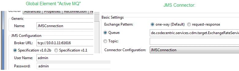 Nun fügen wir ein Global Element vom Typ „Active MQ“ sowie einen JMS Connector hinzu und konfigurieren diese wie abgebildet: