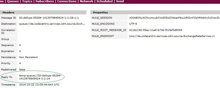 Tatsächlich wird der Nachricht schon zu Beginn die Information mitgegeben, auf welcher Queue auf eine Antwort gewartet wird. Dies wird unter dem Feld „Reply To“ vermerkt. Wir könnten hier nun eine Reply-Queue selbst vorgeben oder diese Arbeit vollständig Mule und ActiveMQ überlassen.