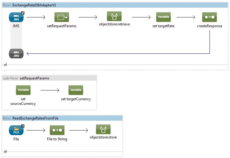 Wir haben zwei Flows: Der untere liest das XML mit den Wechselkursen aus einer Datei und speichert das Ergebnis in einem Object-Store zwischen, der obere nimmt Anfragen entgegen, extrahiert die Anfrage-Parameter (Quell- und Ziel-Kurs), liest den Wechselkurs aus dem Object-Store und wandelt das Ergebnis in ein Response XML um.