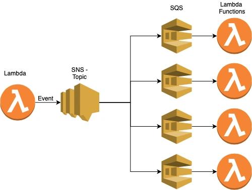 Vom Start weg war uns klar, dass wir die Komposition eines größeren Prozesses möglich machen müssen. Das Ganze jedoch unter dem Gesichtspunkt, dass eine Lambda genau eine Aufgabe übernehmen soll. Nach etwas Recherche haben wir uns für das Integration Pattern „Fan-Out“ entschieden, siehe Abbildung 3. AWS SNS (Simple Notification Service) übernimmt den Publish-Subscribe-Part, und AWS SQS (Simple Queue Service) vor den einzelnen Lambdas sorgt dafür, dass in Fehlerfällen ein Retry möglich ist. Wenn ein Service über mehrer Versuche hinweg keinen Erfolg bringt, wird die Nachricht in eine Deadletter-Queue geschrieben. Wir haben in unserem Projekt bisher keine Lastprobleme, jedoch kann SQS hier auch als eine Art Load-Balancer dienen, um Last zu verteilen.