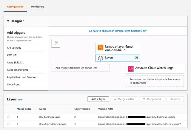 1functions: 2 hello: 3 handler: src/app/handler.hello 4 layers: # layer refs 5 - ... arn...