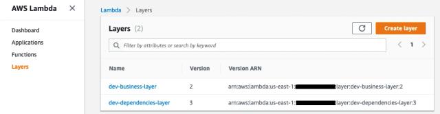 1layers: 2 business: 3 path: businesslayer 4 name: ${self:provider.stage}-business-layer # optional 5 description: Description of what the lambda layer does # optional 6 compatibleRuntimes: # optional 7 - nodejs 8 allowedAccounts: 9 - '*' # all accounts or specify your account!